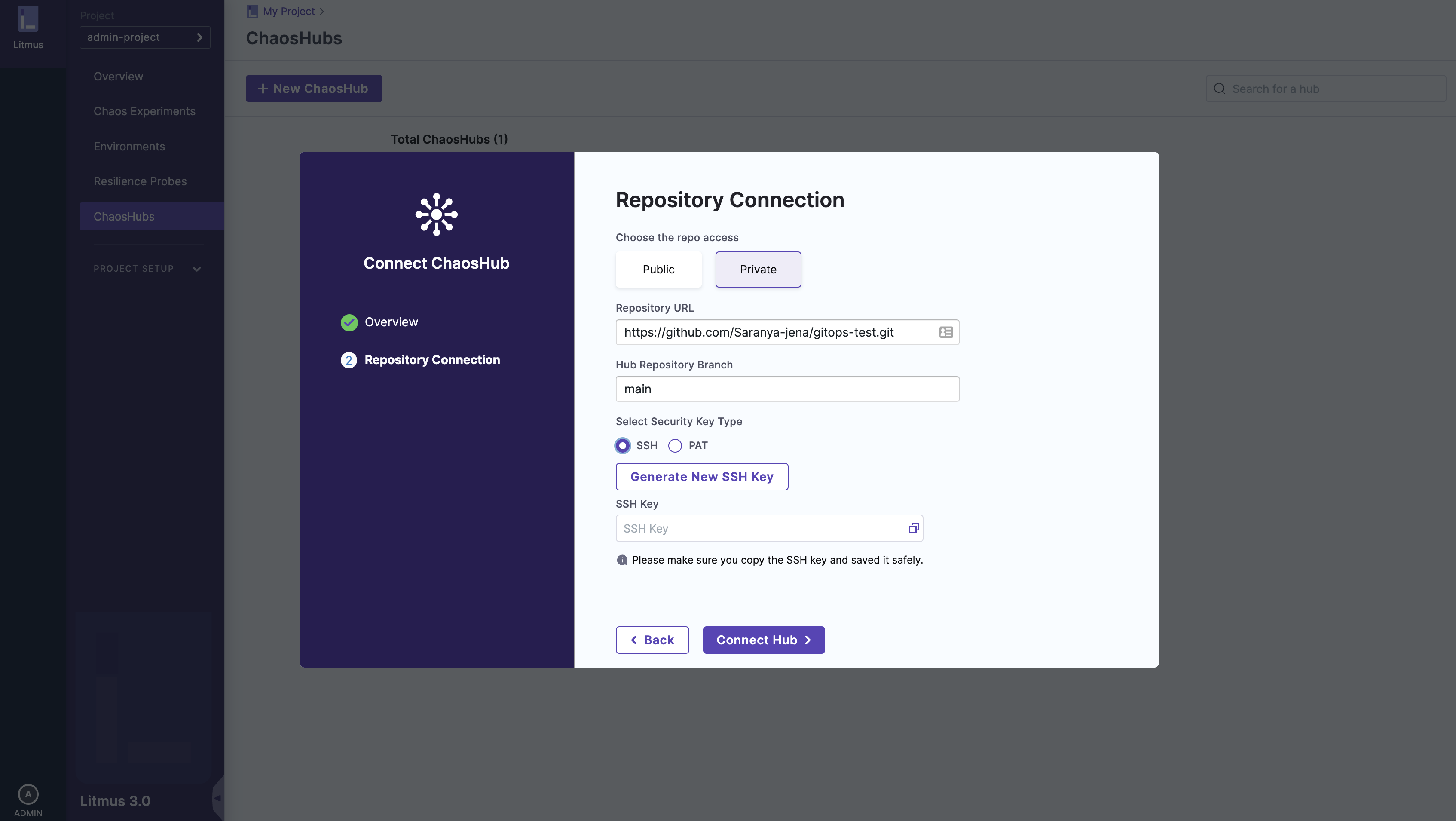 • Chaos experiments can be created from the public ChaosHub which is already connected to your ChaosCenter, or a custom ChaosHub which is a fork of the public ChaosHub where custom faults can be stored.